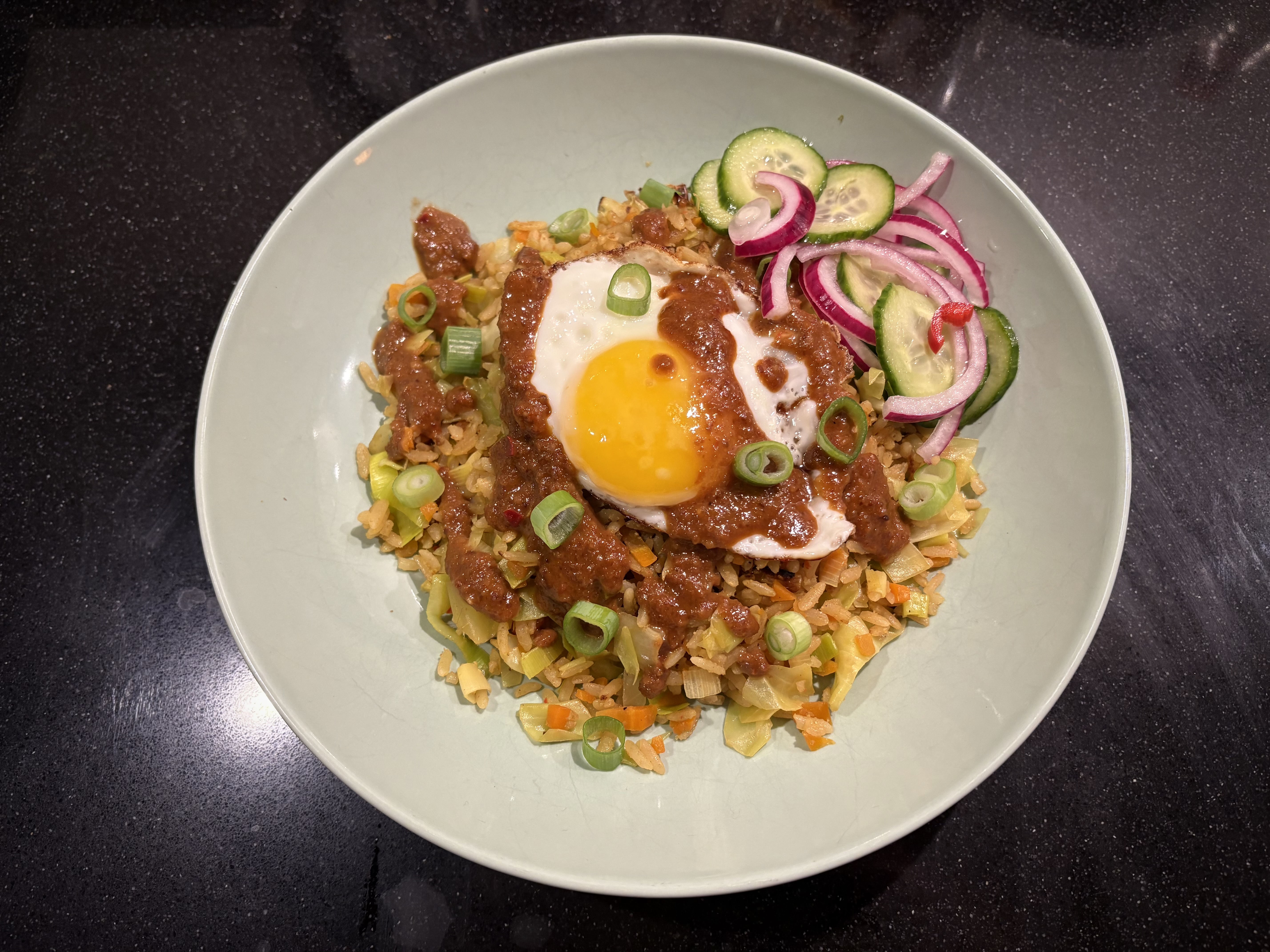 - Verdeel de nasi over de borden en leg bovenop een spiegelei. Garneer met de pindasaus en bosuiringetjes.