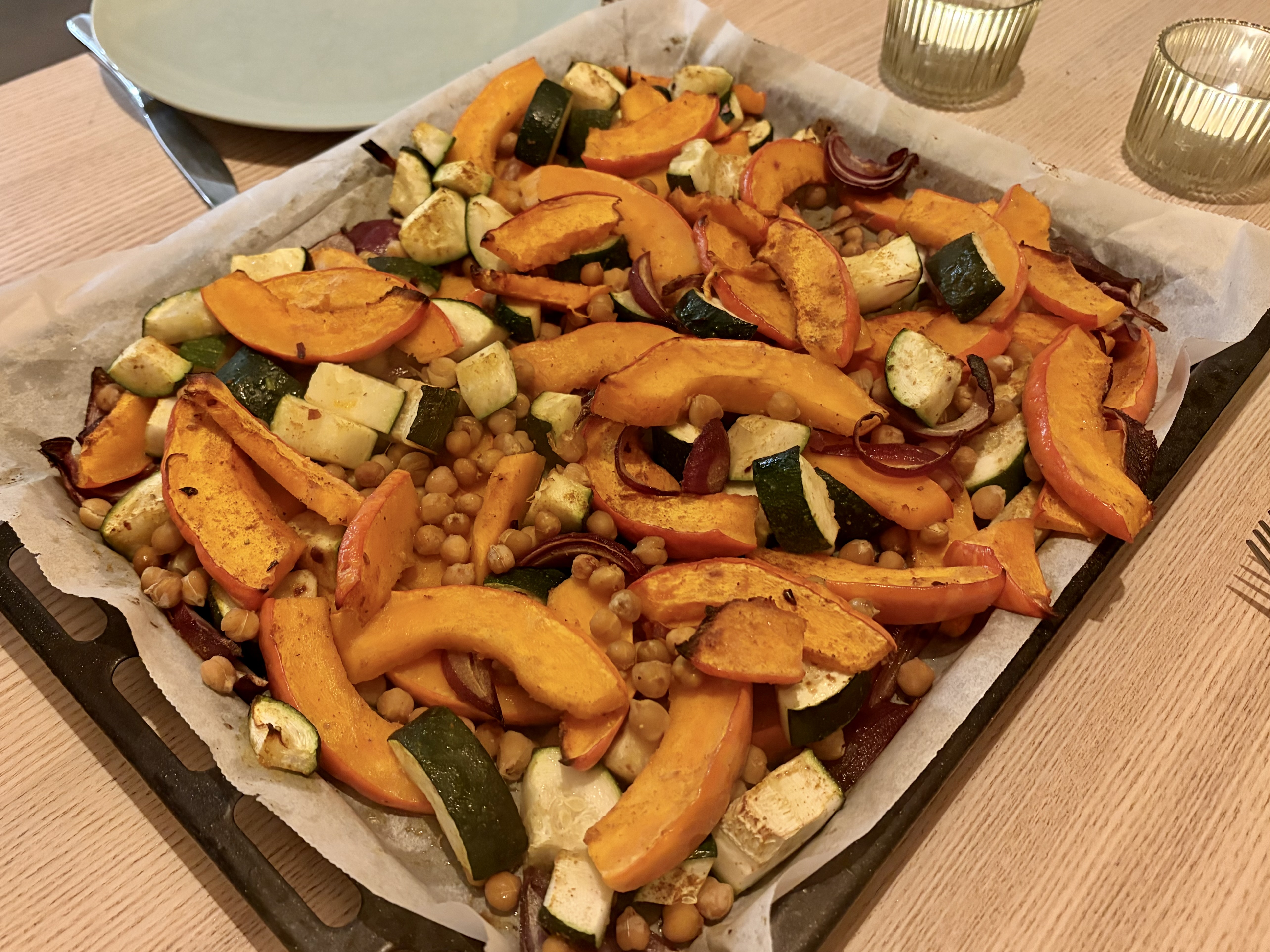 - Breng de groente op smaak met olijfolie, ras el hanout kruiden, chilivlokken, zout en peper. Meng goed.