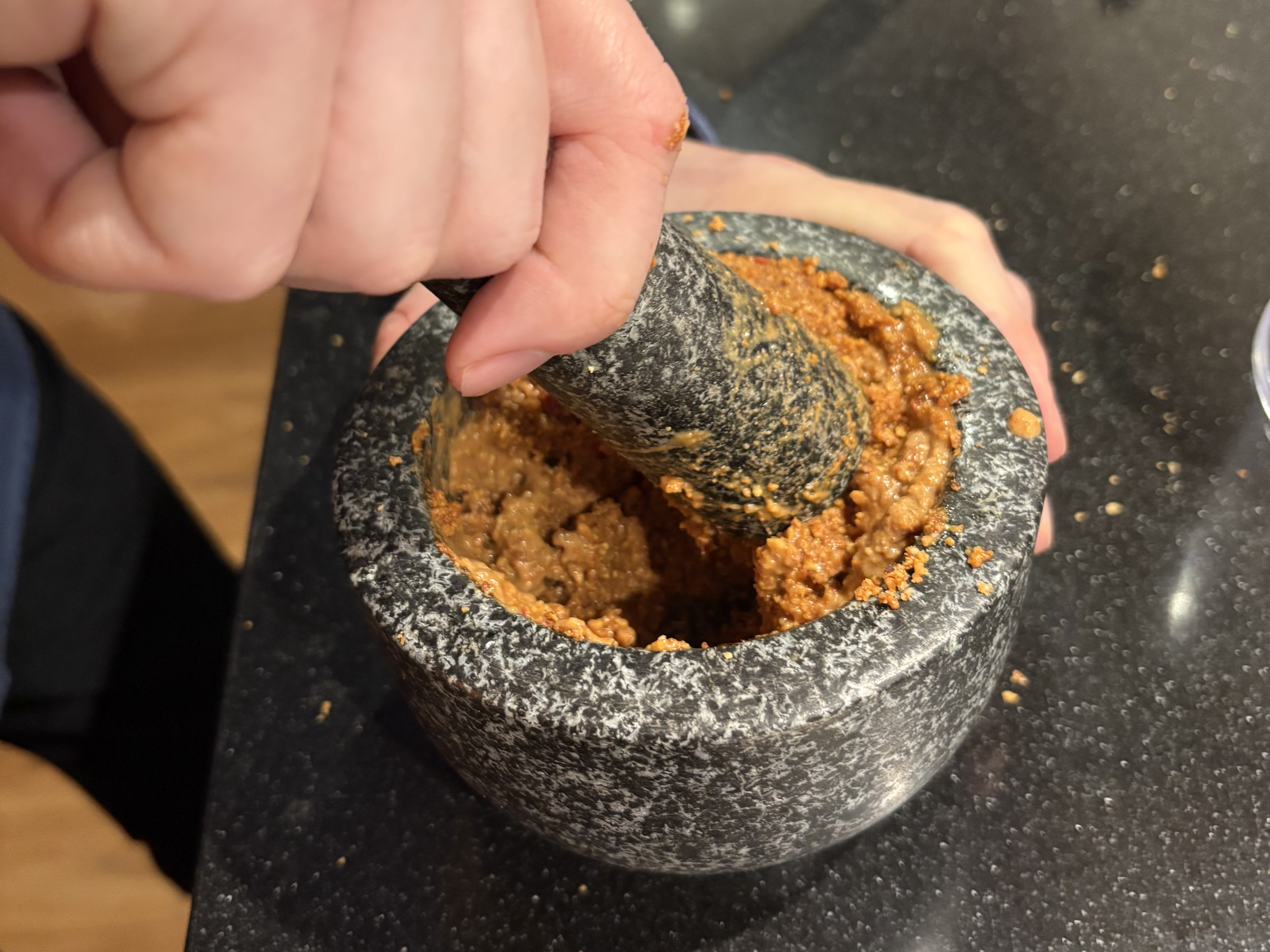 - Doe de chilipeper en palmsuiker samen in de vijzel en stamp tot een gladde pasta.